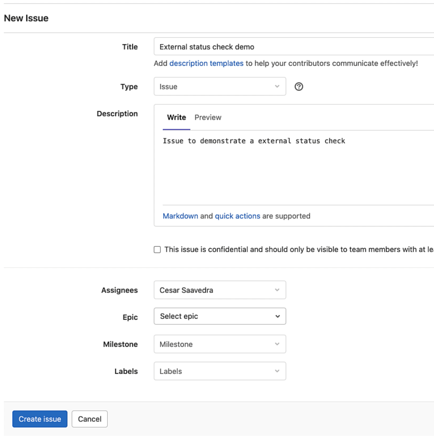 To exercise the external status check for merge requests, we need to create a merge request. But before that, let's create an issue.