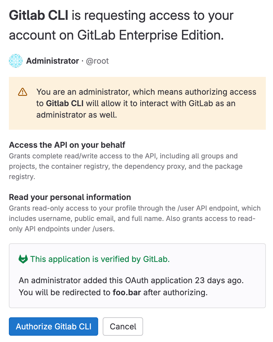 OAuth認証画面で、許可する認証がより明確に説明されるようになりました。また、GitLabが提供するアプリケーションに関しては「erified by GitLab」セクションも表示されます。これまでは、GitLabによって提供されたアプリケーションであってもそうでない場合でも、ユーザーエクスペリエンスは同じでしたが、この新機能により、信頼性がさらに向上します。
