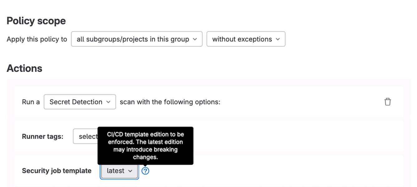 スキャン実行ポリシーが拡張され、ポリシールールを定義する際に、defaultlatest のGitLabテンプレートのどちらかを選べるようになりました。default では現在の動作が反映されている一方、ポリシーを latest に更新することで、 指定されたセキュリティアナライザーの最新テンプレートでのみ利用可能な機能を使用できます。