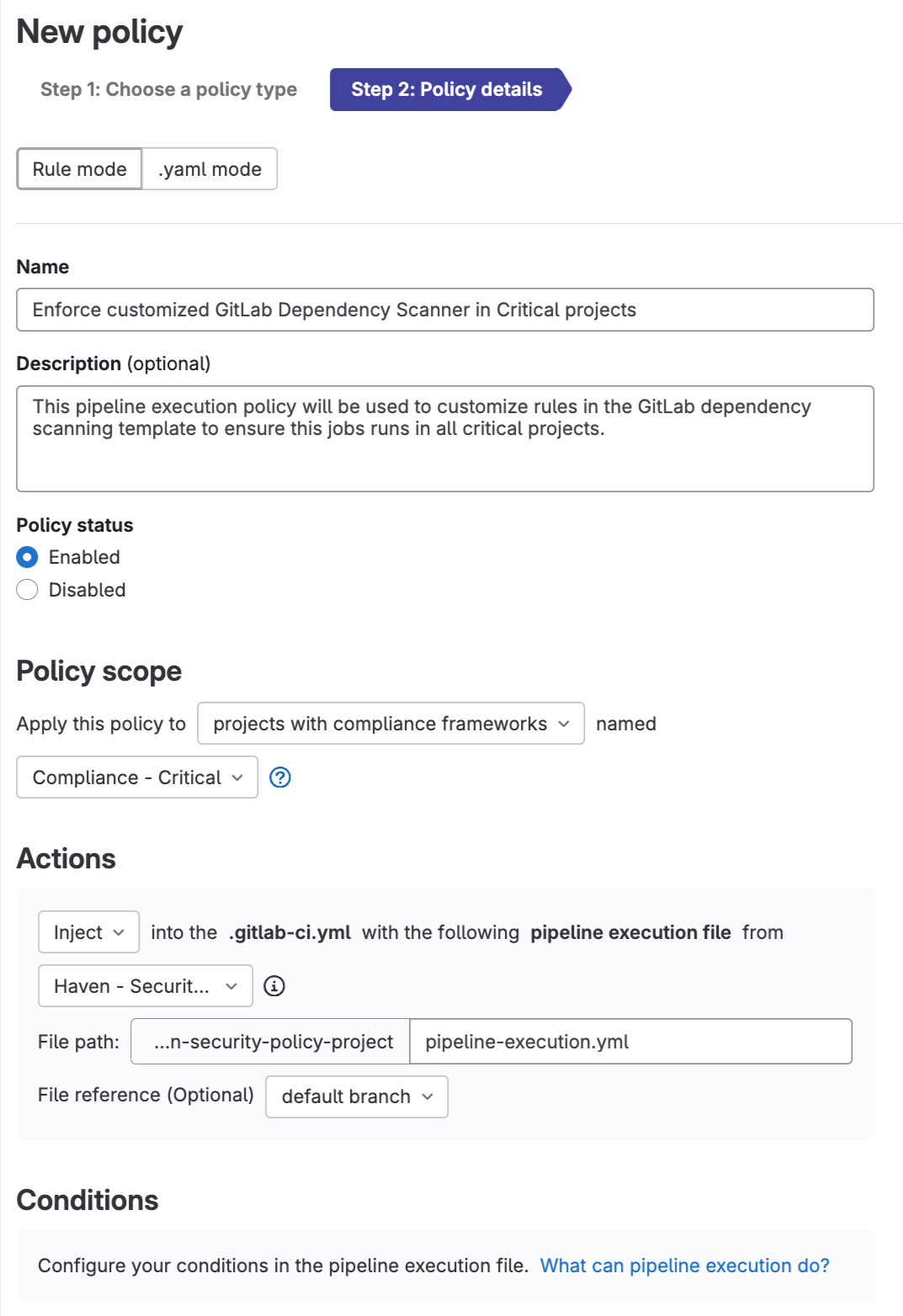 セキュリティチームやコンプライアンスチームは、このパイプライン実行ポリシータイプを使用することで、カスタマイズしたGitLabセキュリティスキャンテンプレートや、GitLabまたはパートナーがサポートするCIテンプレート、サードパーティのセキュリティスキャンテンプレートを適用できるほか、CIジョブ経由でカスタムレポートルール、またGitLab CI経由でカスタムスクリプトやルールを実施できます。