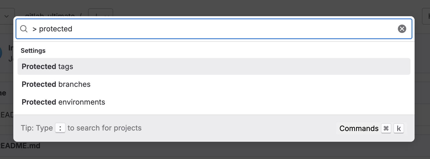 今回のリリースでは、コマンドパレットからプロジェクト設定を検索できるようになりました。プロジェクトを開き、「検索または移動先...」を選択し、「>」キーでコマンドモードに入り、設定セクション名(例:「保護タグ」)を入力してみてください。表示された結果をクリックすると、その設定に直接移動できます。