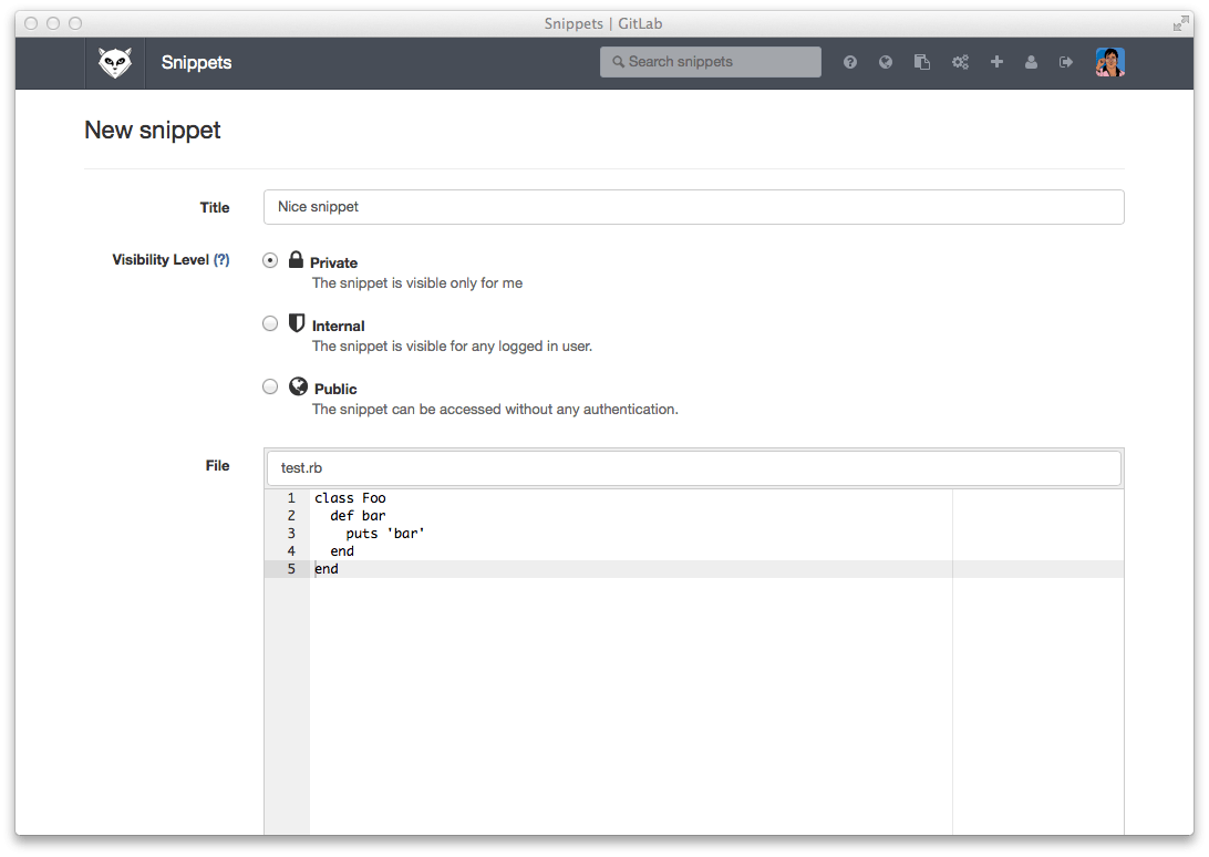 You can now create snippets with various visibility levels. A public snippet is visible for everyone, even people that are not signed into your GitLab instance. Internal snippets are only visible to authorized users and private snippets are only visible to those with explicit access.